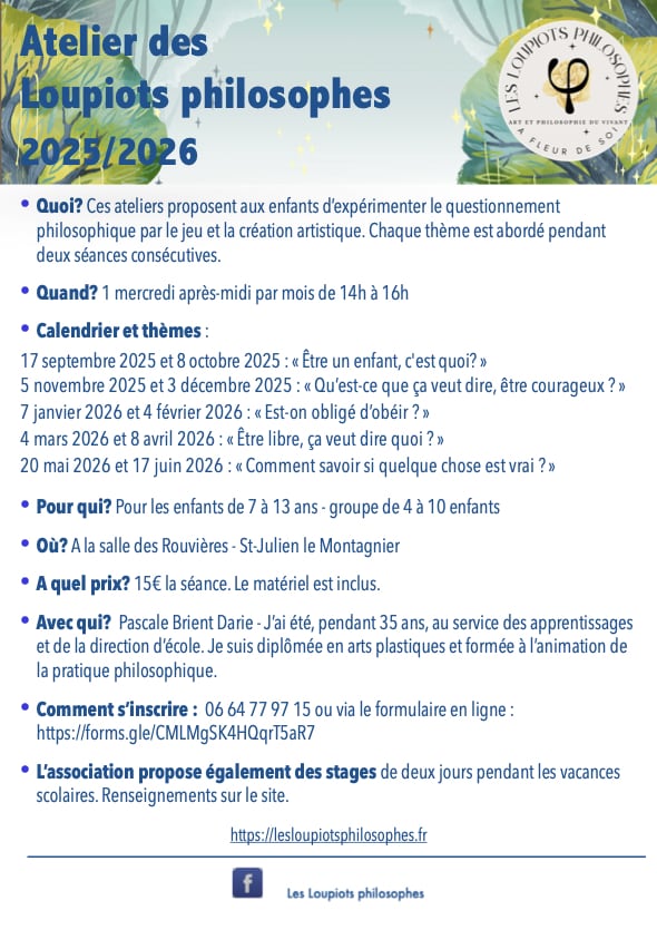 Ă travers des histoires, des questions Ă©tonnantes et des discussions bienveillantes, les enfants apprennent Ă rĂ©flĂ©chir par eux-mĂȘmes, Ă Ă©couter les autres et Ă exprimer leurs idĂ©es avec confiance. Par le jeu, la peinture, le collage ou le modelage, on ouvre la voie aux mots : ici, crĂ©er avec ses mains et son imagination prĂ©pare, nourrit et enrichit la discussion philosophique.